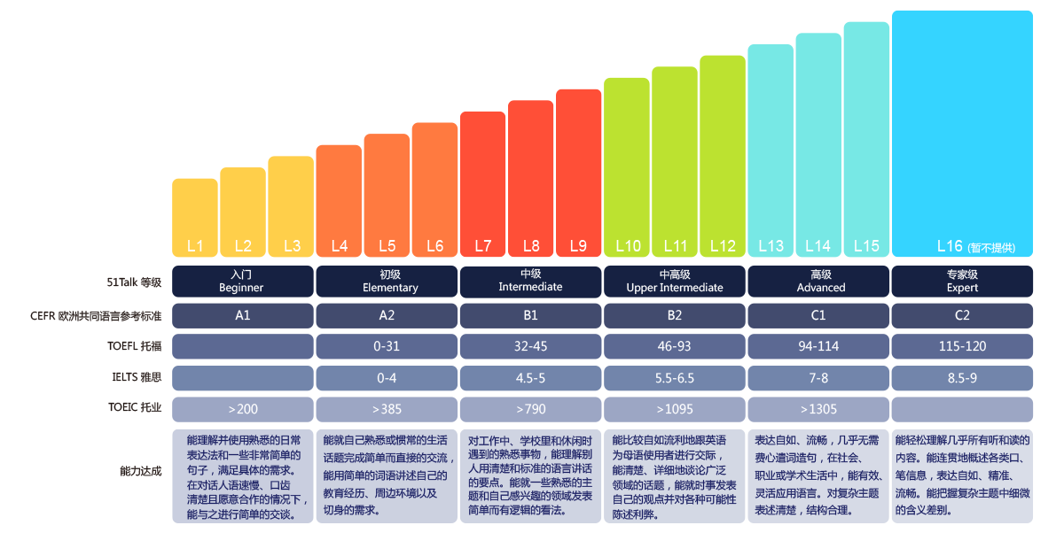 来自全球的拥有超过10年教学经验的专业教研团队,依照欧洲语言共同框架(CEFR),花费超过500小时以上精心打造的更适合中国英语学习者的课程体系,听说读写全面覆盖的教学内容,实用而有趣的教材设计针对不同阶段学员水平,从零基础入门到精通的16个级别的英语晋升阶梯,正在等待你的攀升!